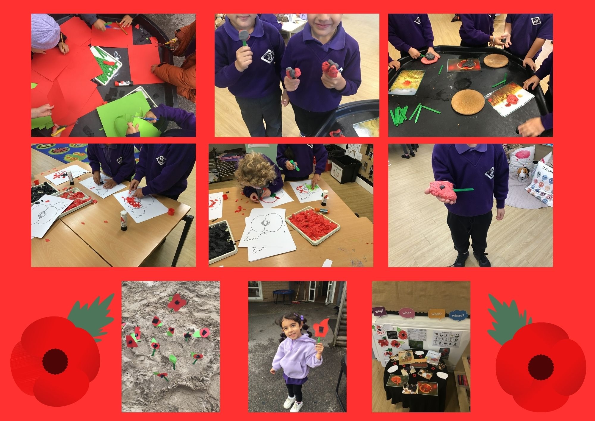 We know that many years ago there were two World Wars in which lots of people sadly lost their lives. Every year on 11th November, we remember those who fought and lost their lives, and those who continue to help protect our country. We wear poppies as a symbol of Remembrance and the children have enjoyed engaging in some poppy themed activities. They have decorated poppies with red paper and tissue paper and have printed Duplo poppies with paint. We also made our very own Remembrance Poppy Field in the sand pit. On Tuesday, we had a whole school Remembrance Day assembly and held a two-minute silence as a mark of respect.