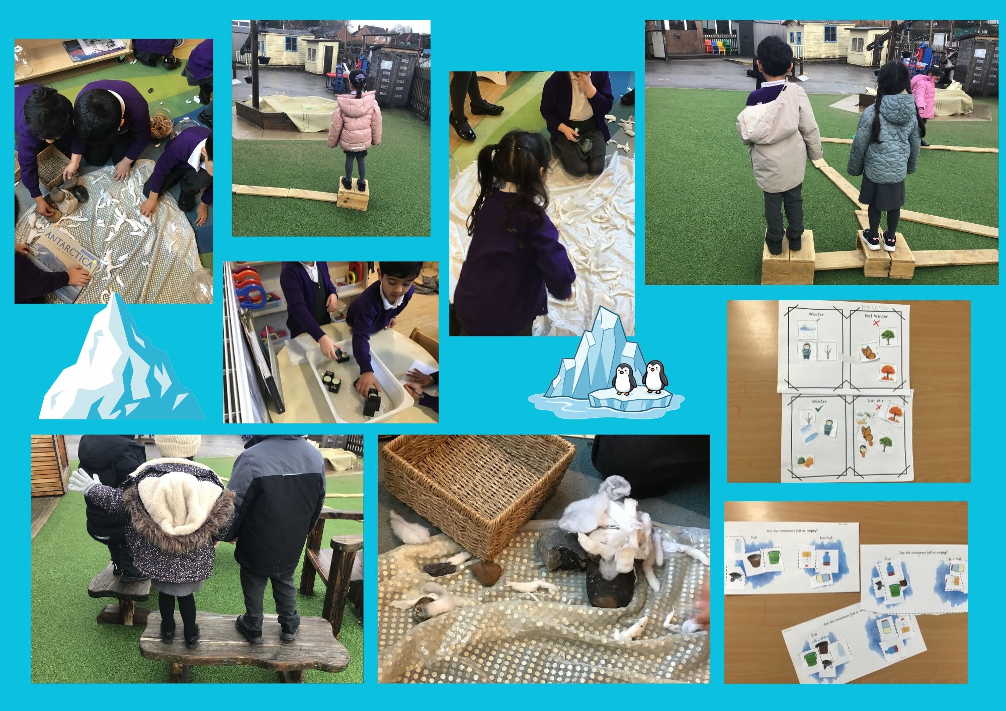 It has been very cold this week and the children have thoroughly enjoyed playing in the snow as well as exploring the ice this week. They have also been enjoying creating polar scenes in the small world area and have been using photographs from non-fiction books to help them create their scenes.